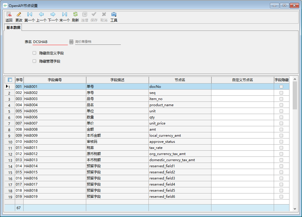 易助OpenAPI查詢和讀取接口默認(rèn)返回全部單據(jù)字段,如果集成時(shí)僅需要部分字段,支持在易助中通過(guò)TPASC20(OpenAPI節(jié)點(diǎn)設(shè)置)配置隱藏自定義字段、隱藏不需要的字段,以快速解析數(shù)據(jù)、減少數(shù)據(jù)傳輸、提升接口性能。
